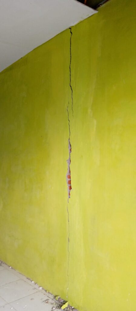 Dugaan sementara retakan terjadi karena kondisi tanah yang labil hingga mengalami penurunan tanah secara drastis. Kondisi bangunan ini sangat berbahaya apabila ditempati.