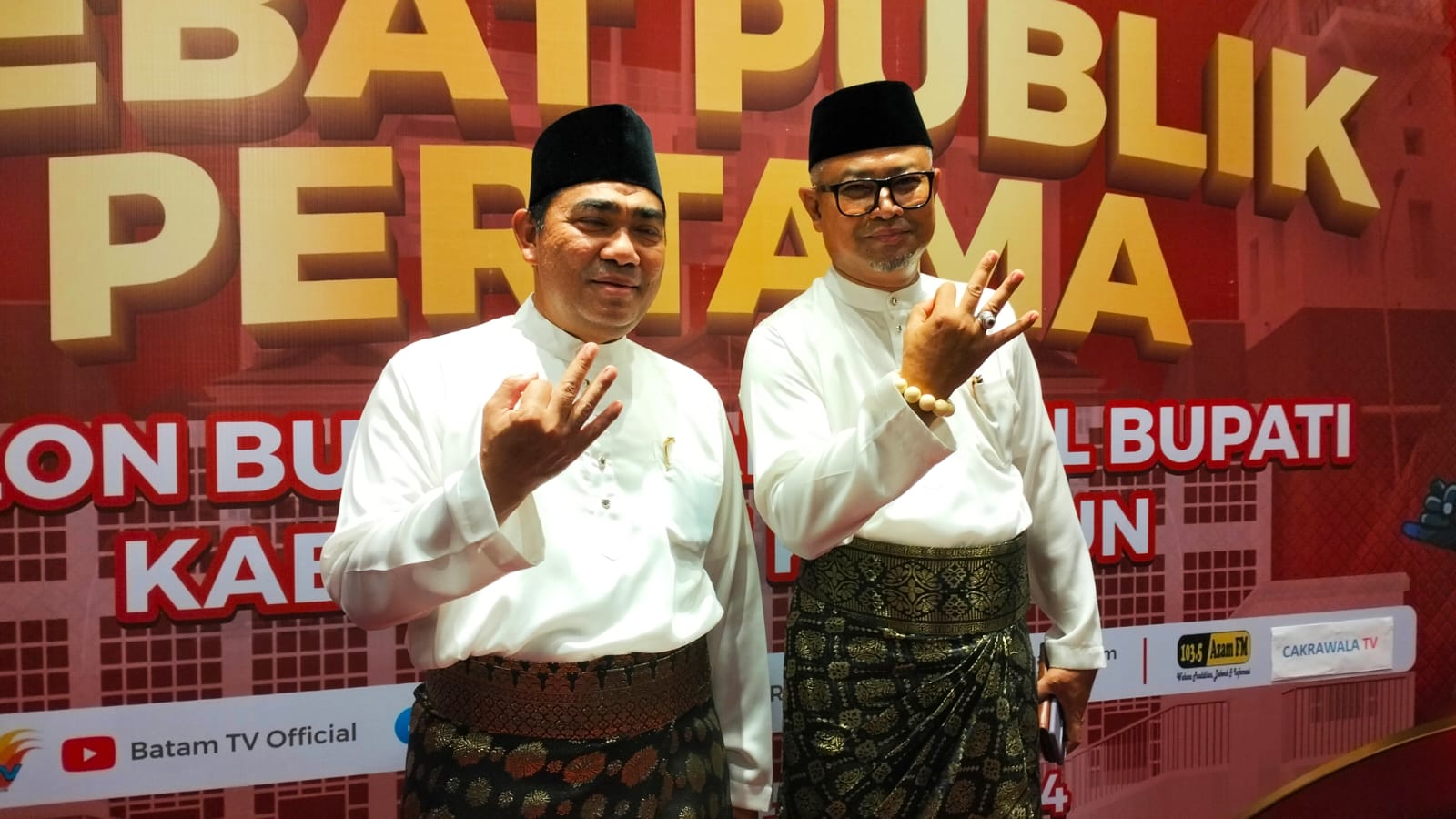 Calon Bupati dan Wakil Bupati Karimun nomor urut 3 Bakti Lubis-Raja Baktiar usai mengikuti Debat perdana yang digelar oleh KPU Karimun. Sabtu (19/10/24) malam. Foto : Potretnusantara.id