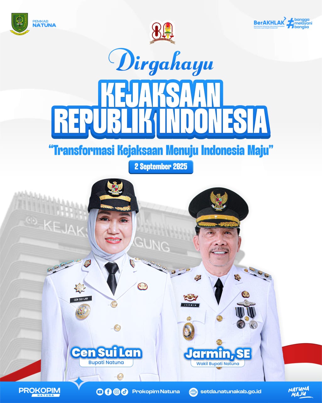 Natuna, Potretnusantara.id – Pemerintah Kabupaten (Pemkab) Natuna melalui Bupati Cen Sui Lan dan Wakil Bupati Jarmin, SE, menyampaikan ucapan selamat atas peringatan Hari Ulang Tahun (HUT) ke- 80 Kejaksaan Republik Indonesia yang jatuh pada 2 September 2025.