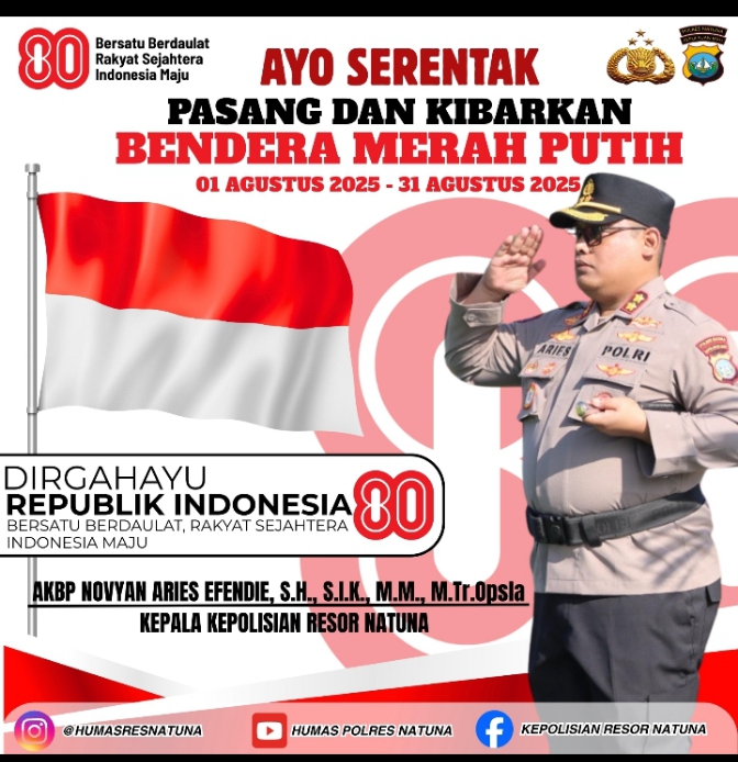 Potretnusantara.id, Natuna – Dalam rangka menyambut Hari Ulang Tahun ke-80 Kemerdekaan Republik Indonesia, Kapolres Natuna AKBP Novyan Aries Efendie, S.H., S.I.K., M.M., M.Tr.Opsla mengimbau seluruh masyarakat Kabupaten Natuna untuk serentak memasang dan mengibarkan Bendera Merah Putih di depan rumah, kantor, sekolah, dan tempat usaha mulai 1 hingga 31 Agustus 2025.