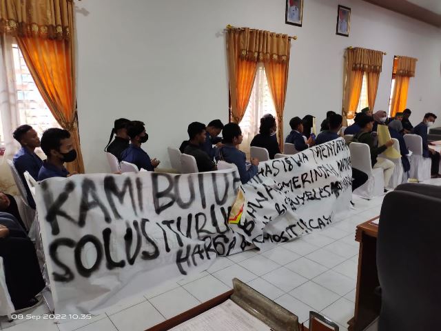 Sambil membentang spanduk yang bertuliskan penyataan penolakan kenaikan harga BBM, mahasiswa kemudian disambut baik DPRD Natuna dengan meminta rombongan mahasiswa masuk ke dalam Ruang Rapat Paripurna DPRD Natuna untuk melakukan audiensi.
