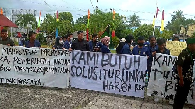“Kami mahasiswa Natuna menyatakan sikap bahwa kami menolak kenaikan BBM,” kata Asmizar dengan suara lantang.