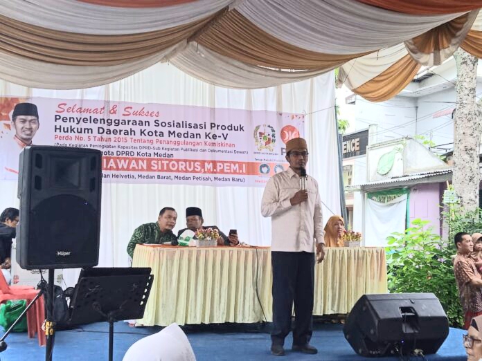 MEDAN, Potret Nusantara.id — Agenda Wakil Ketua Komisi DPRD Medan, Fraksi Partai Keadilan Sejahtare Dr.Rudiawan Sitorus, M.Pem.I mendorong Pemerintah Kota Medan untuk memberikan anggaran yang besar dalam upaya mensejahterakan masyarakat Kota Medan. Dorongan ini disampaikannya saat melaksanakan Sosialisasi Produk Hukum Daerah, Peraturan Daerah Nomor 5 Tahun 2015 tentang Penanggulangan Kemiskinan Kota Medan, yang dilaksanakan di Jalan Jangka, Kelurahan Sei Putih Barat, Kecamatan Medan Petisah, Senin (16/05/2022).