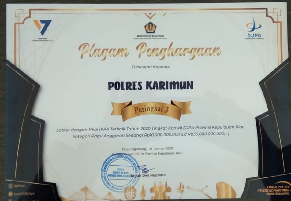 Dua piagam penghargaan yang diterima Polres Karimun yaitu, sebagai peringkat kedua Satuan Kerja (Satker) terbaik dalam nilai indikator pekerja pelaksanaan anggaran (IKPA) di wilayah kerja KPPN Batam kategori pagu sedang.
