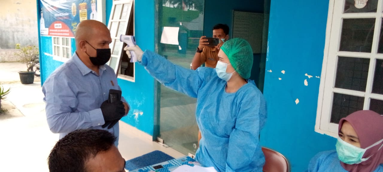 Ketua Komisi I DPRD Natuna, Wan Arismunandar sebelum masuk ke ruangan vaksinasi mengikuti protokol kesehatan pengecekan suhu tubuh oleh petugas Puskesmas Ranai.