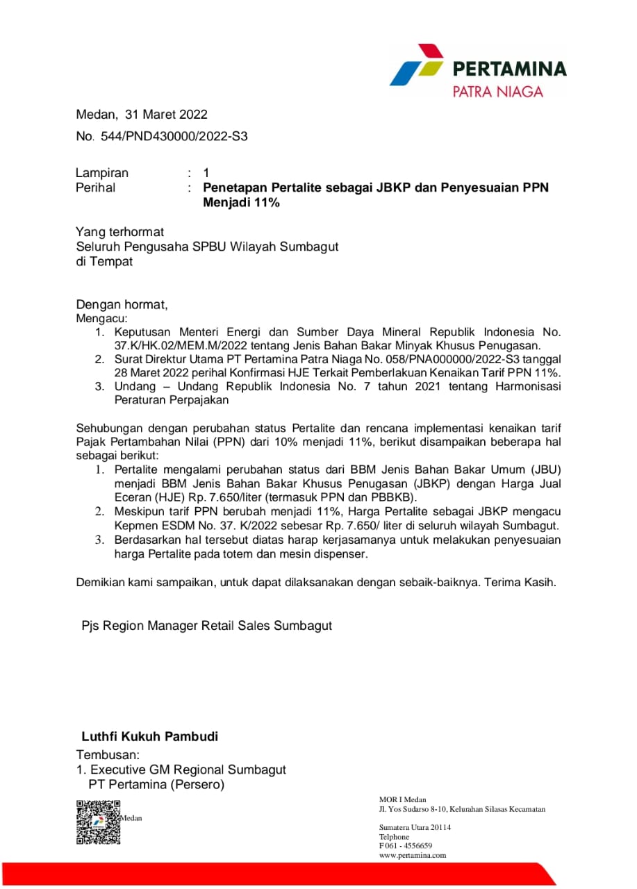 Sehubungan dengan perubahan status Pertalite dan rencana implementasi kenaikan tarif Pajak Pertambahan Nilai (PPN) dari 10% menjadi 11%.