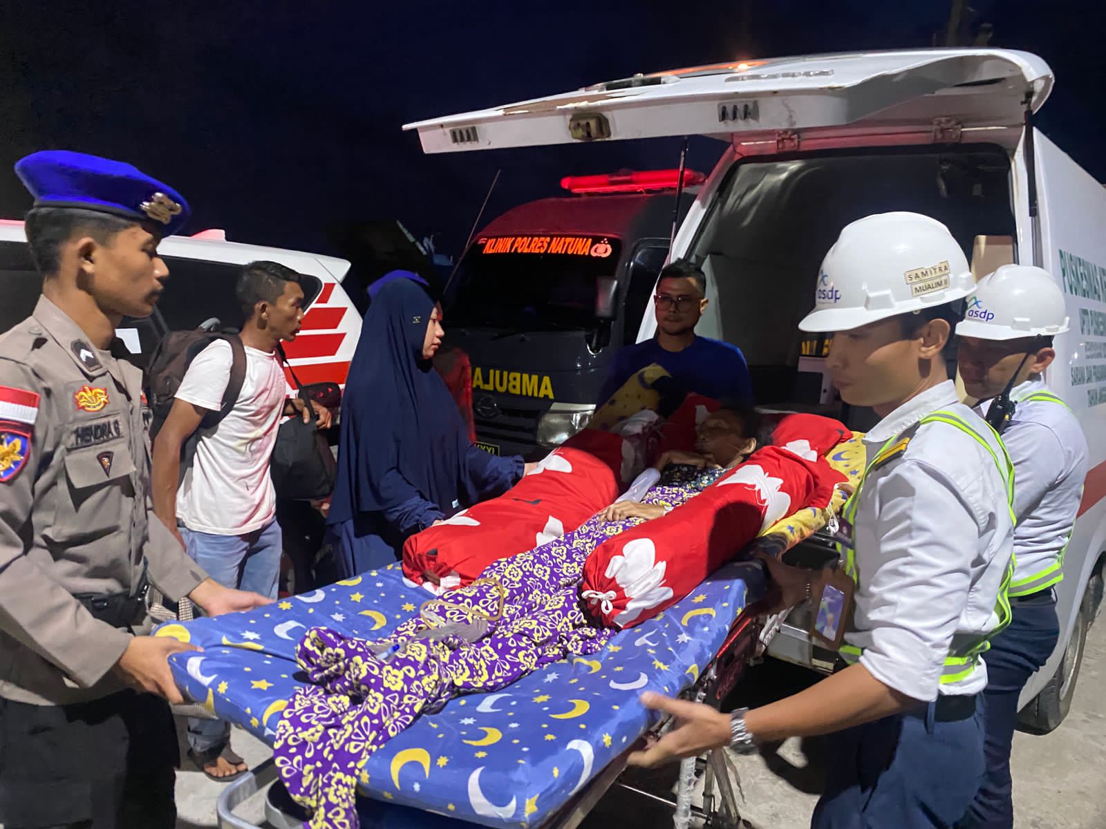 Ambulans Polres Natuna disiapkan untuk mengevakuasi pasien menuju RSUD Natuna, sementara petugas kesehatan melakukan pendampingan selama proses pemindahan dari kapal hingga ke kendaraan medis. Sinergi lintas instansi tersebut menjadi bentuk kesiapsiagaan pelayanan bagi masyarakat, khususnya warga kepulauan yang mengandalkan transportasi laut.