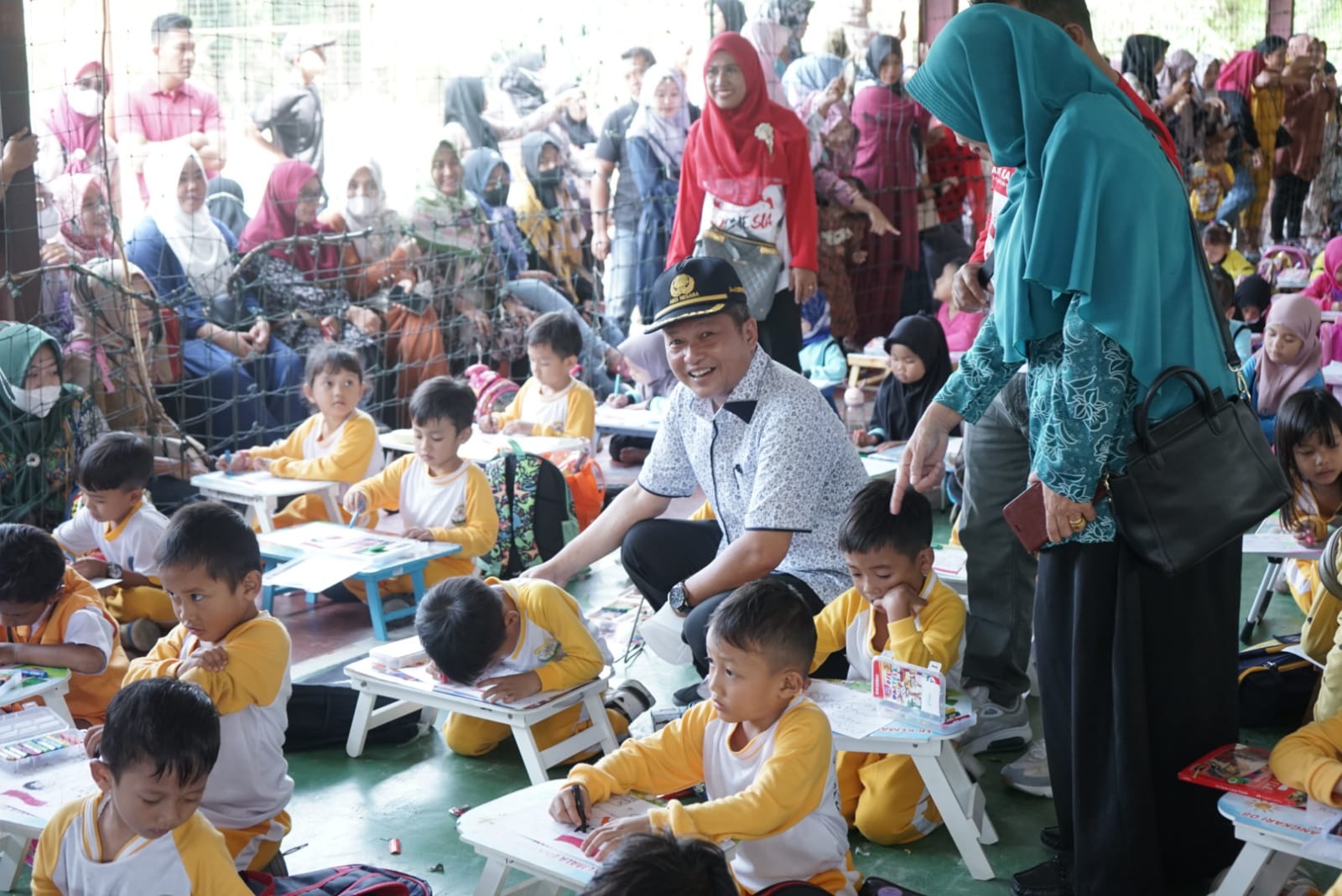 Diakhir kegiatan Kepala Dinas Pendidikan Kabupaten Asahan dan Wakil Ketua IV Bidang Kesehatan Keluarga dan Lingkungan Bunda Paud Kabupaten Asahan melihat anak-anak PAUD yang sedang asik mengikuti lomba mewarnai didampingi oleh Ketua Himpaudi Kabupaten Asahan beserta panitia pelaksana. (Paimin).