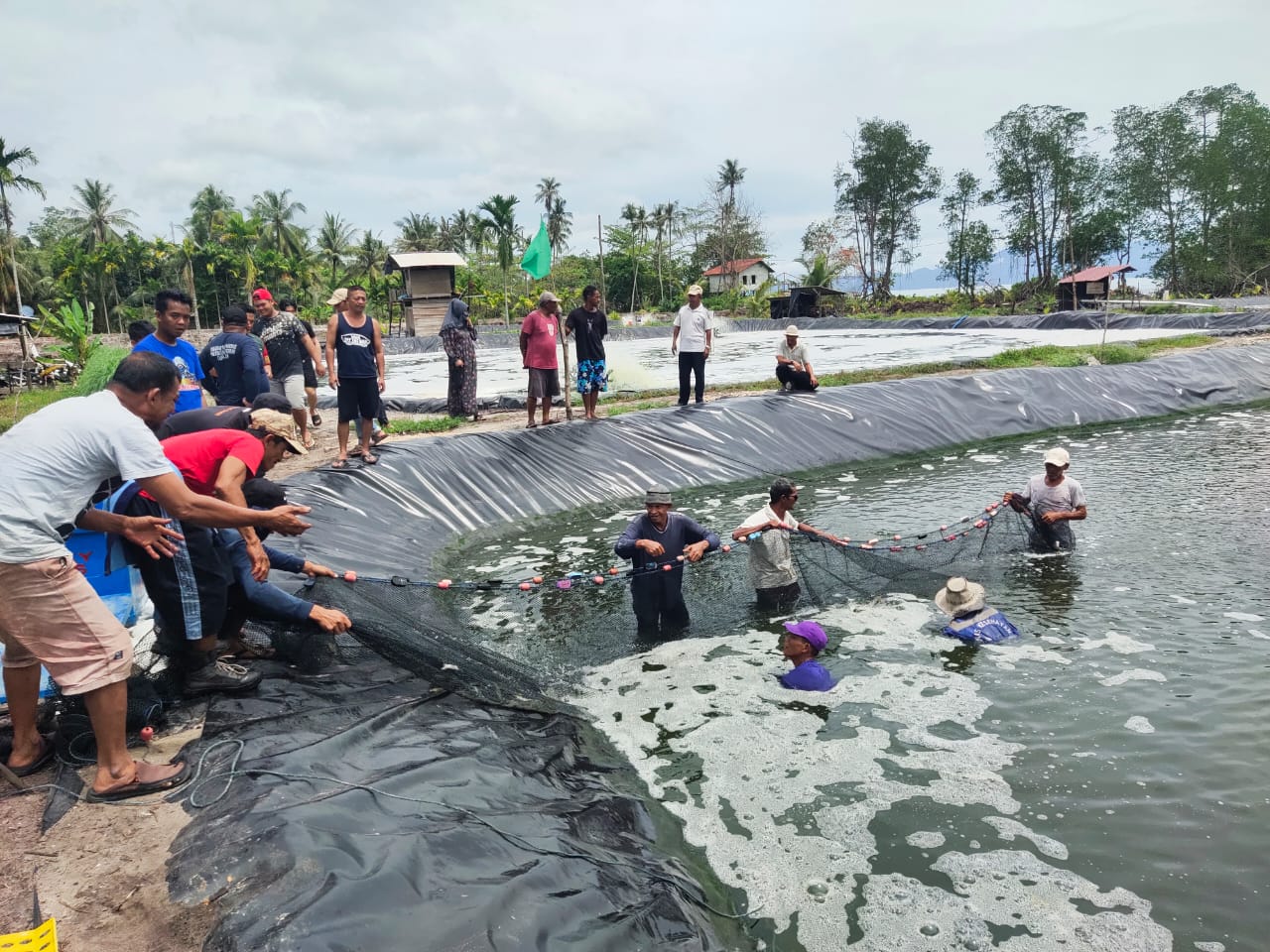 Kepala Desa Berindat Yusnani didampingi Camat Singkep Pesisir M Saman, Babinkantibmast, Babinsa Tokoh masyarakat, memanen udang vaname di Desa Berindat, Kecamatan Singkep Pesisir, Kabupaten Lingga, Kepulauan Riau. Minggu (23/3/2025).