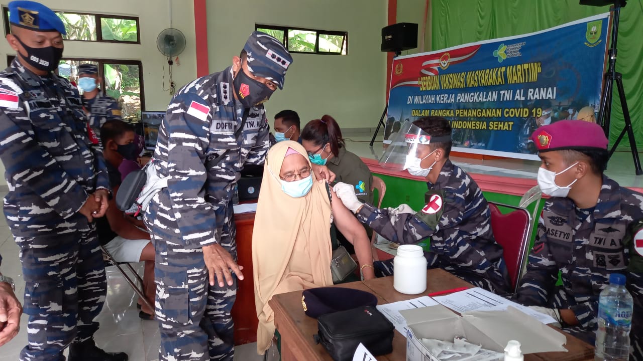 Komandan Lanal Ranai Kolonel Laut (P) Dofir memimpin secara langsung kegiatan Serbuan Vaksinasi Masyarakat Maritim di desa Sabang Mawang Balai, di dampingi oleh Kepala Balai Pengobatan (Ka. BP) Letda Laut (K) Kastari, Danposal Sabang Mawang Letda Laut (P) Ainur Rofik dan Paur Hartib Letda Laut (PM) Bambang S.B.