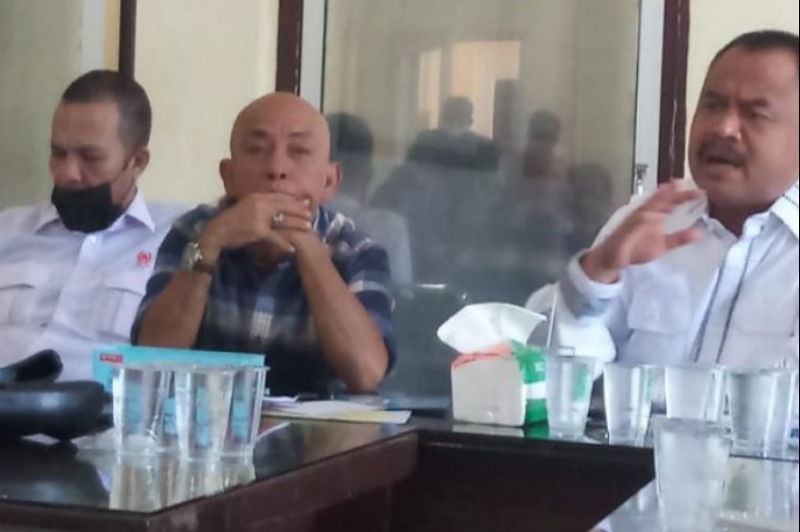 Farianda Putra Sinik, SE, didampingi Sekretaris SR Harmonangan Panggabean, dan Ketua Panitia, Rifki Warisan, Sabtu (18/12/2021), di Kantor PWI Sumut Medan.