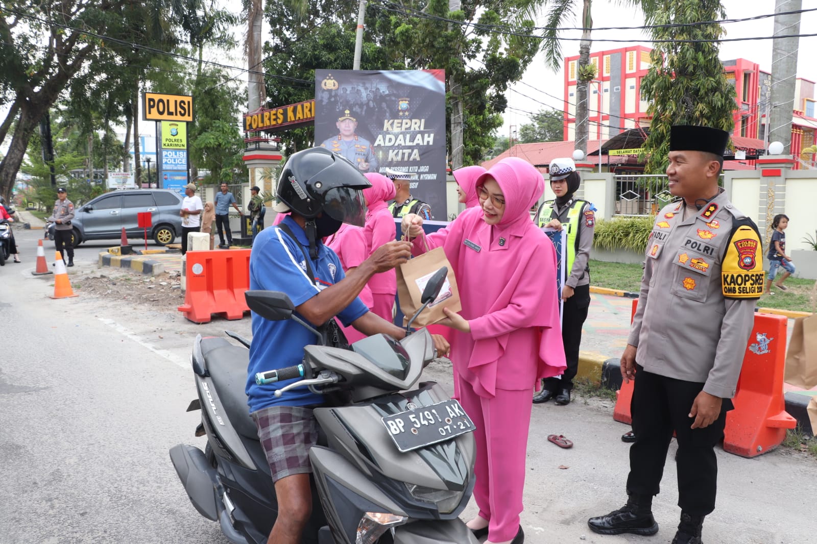 Ada sebanyak 100 paket takjil yang Kapolres Karimun AKBP Fadli Agus didampingi Ketua Bhayangkari cabang Karimun Ny. Lya Fadli Agus beserta pengurus Bhayangkari Cabang Karimun bagikan kepada pengendara yang melintas di depan Mako Polres Karimun.