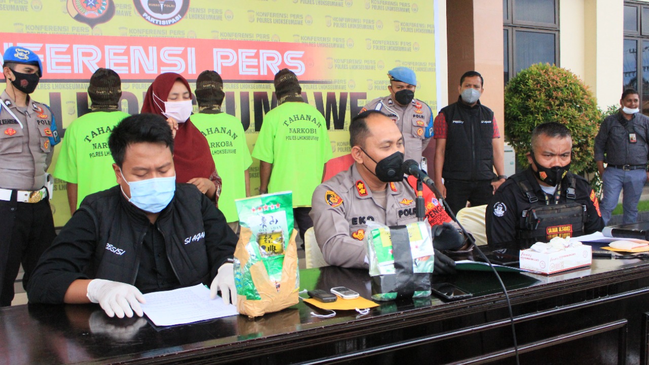 Kapolres Lhokseumawe AKBP Eko Hartanto SIK MH saat konferensi pers di Mapolres Lhokseumawe mengatakan, dalam pengungkapan kasus ini personel Sat Res Narkoba Polres Lhokseumawe juga berhasil membekuk tiga tersangka dan menyita sebanyak 2 kg lebih narkotika jenis sabu – sabu.
