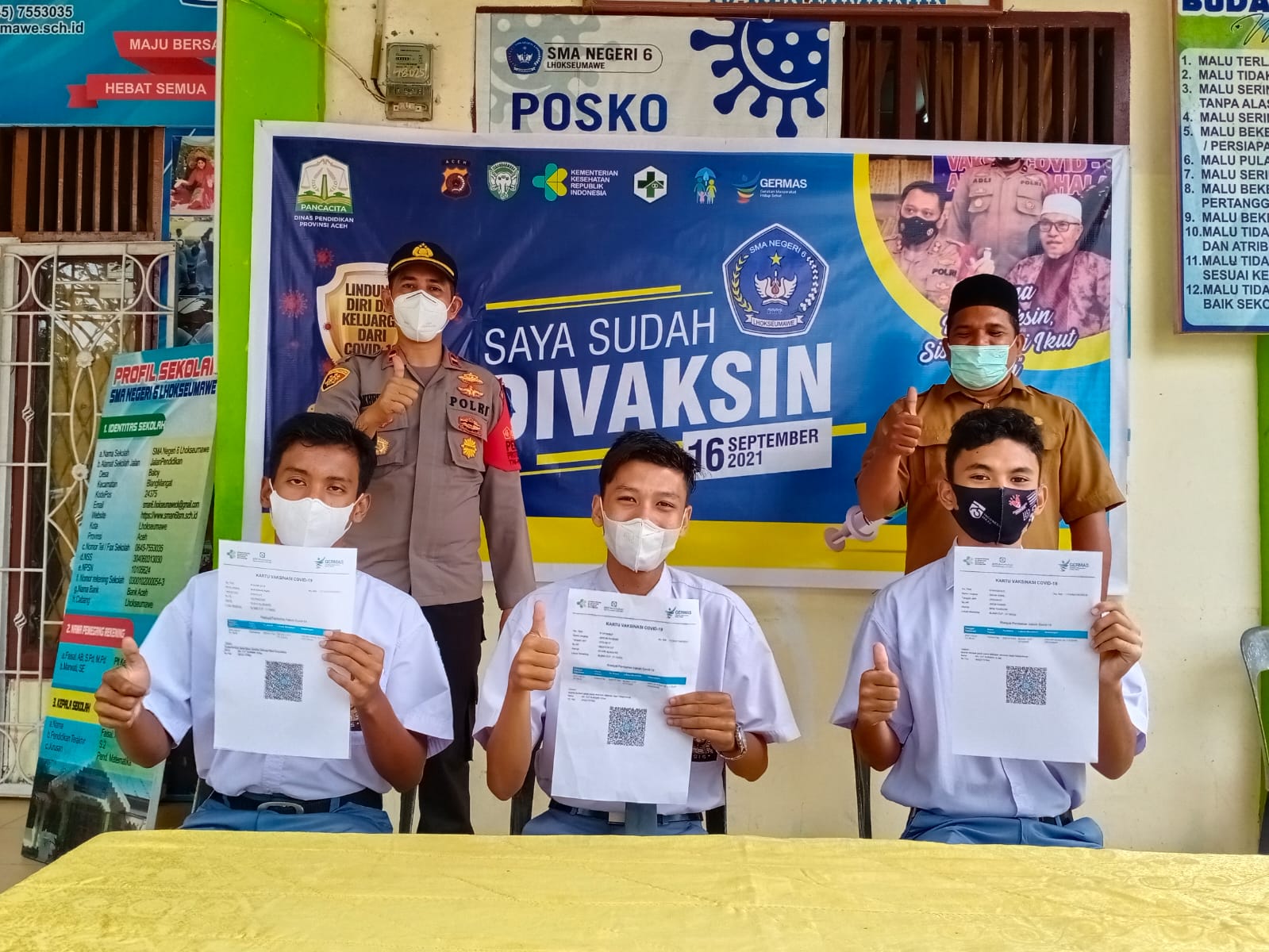 Contoh seperti SMA 6 Lhokseumawe,ia mendampingi langsung para siswa yang ingin melakukan vaksin dari proses pengisian formulir, screening,dan penyuntikan. Serta memberi arahan kepada para murid agar jangan takut divaksin dan selalu patuh prokes dengan cara,mencuci tangan,jaga jarak,dan pakai masker.