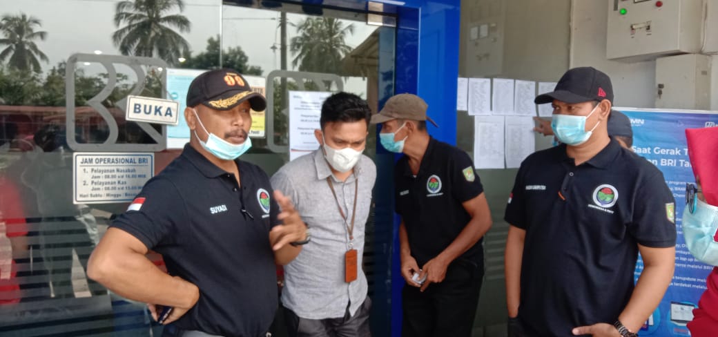 ” BRI agar memperhatikan Prokes, saya menghimbau agar menyiapkan tempat duduk antrian dengan menjaga jarak, warga yang datang berurusan ke bank ini wajib pakai masker, dan menyediakan tempat cuci tangan yang mudah dilihat ” ujar Kades.