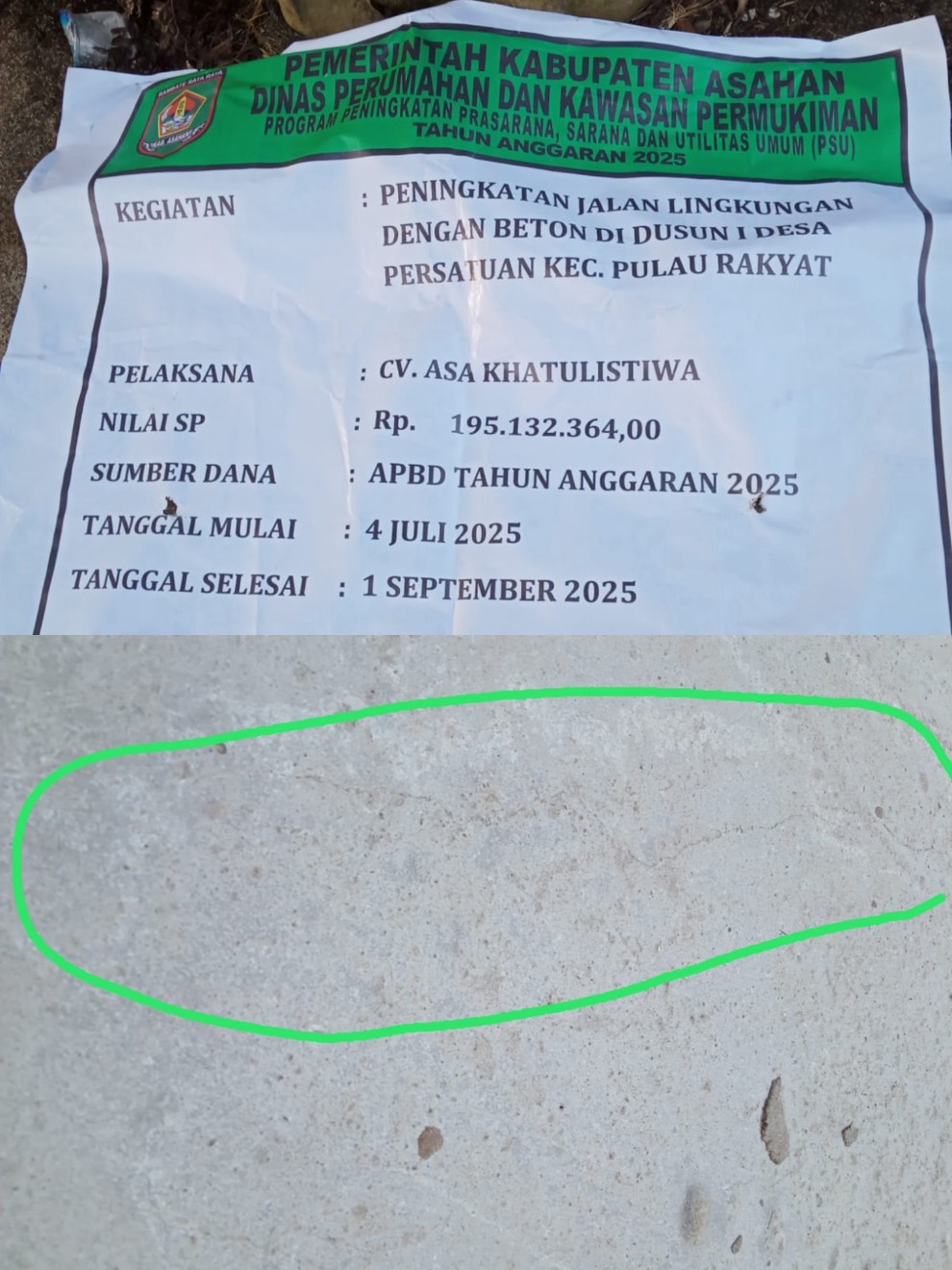 ASAHAN, Potretnusantara.id – Proyek peningkatan jalan lingkungan dengan beton di Dusun 1 Desa Persatuan, Kecamatan Pulau Rakyat dari Dinas Perumahan dan Kawasan Permukiman Kabupaten Asahan yang bersumber dari APBD Asahan tahun 2025 dengan pagu anggaran sebesar Rp 195.132.364 yang dikerjakan oleh CV Asa Khatulistiwa tidak terdapat volume panjang dan lebar ruas jalan di papan proyek.