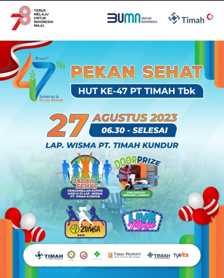 Peringatan HUT ke-47 PT Timah Tbk mengusung tema ‘Selaras dan Kerja Keras’. Selain Pekan Sehat kegiatan HUT ke-47 Perusahaan juga telah menggelar kegiatan bakti sosial seperti khitanan massal dan donor darah di wilayah operasional perusahaan. Rangkaian kegiatan Pekan Sehat PT Timah Tbk di Kundur yakni Jalan Sehat (Fun Walk) dan Zumba bersama masyarakat dan juga hiburan.