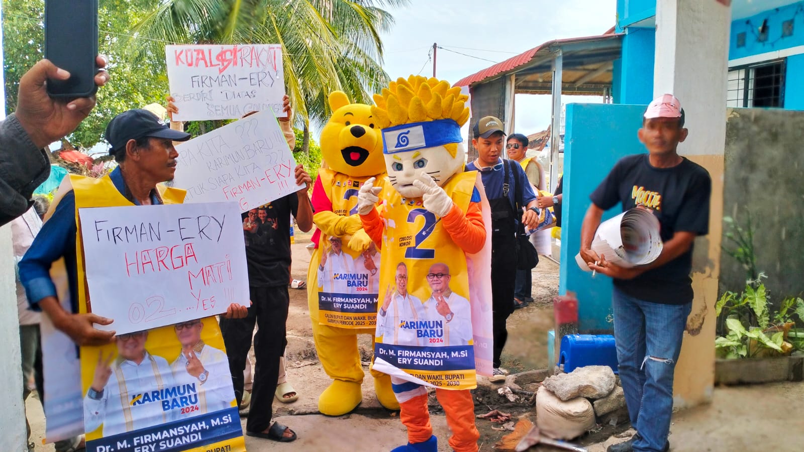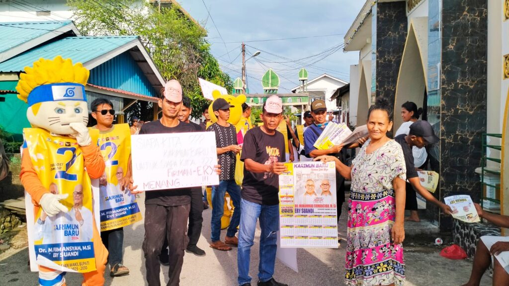 Karimun, Potretnusantara.id – Aksi kampanye relawan Venture pasangan calon (Paslon) Bupati dan Wakil Bupati Karimun Nomor Urut 2, Muhammad Firmansyah dan Ery Suandi tergolong unik. Mereka mendatangi masyarakat secara ‘door to door’ sambil mengenakan kostum Naruto dan Winnie The Pooh.