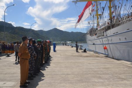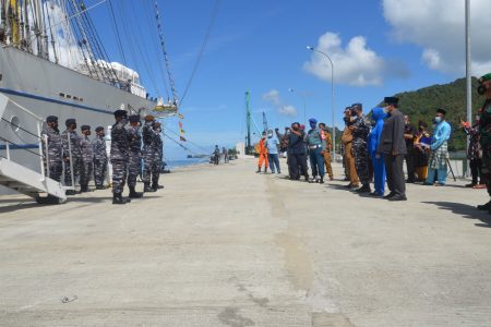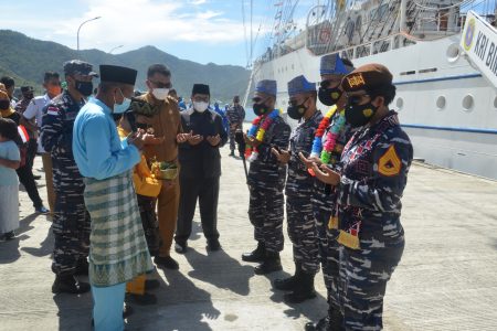 NATUNA, Potretnusantara.Id – Bupati Natuna, Wan Siswnadi didampingi Sekda Natuna, Boy Wijanarko Sambut kedatangan KRI KRI Bima Suci – 945 dan Taruna Akademi Angkatan Laut (AAL) tingkat III angkatan 68 tahun 2021, di Faslabuh TNI Angkatan Laut Selat Lampa kecamatan Bunguran Barat Kabupaten Natuna Provinsi Kepri, Selasa (28/9).
