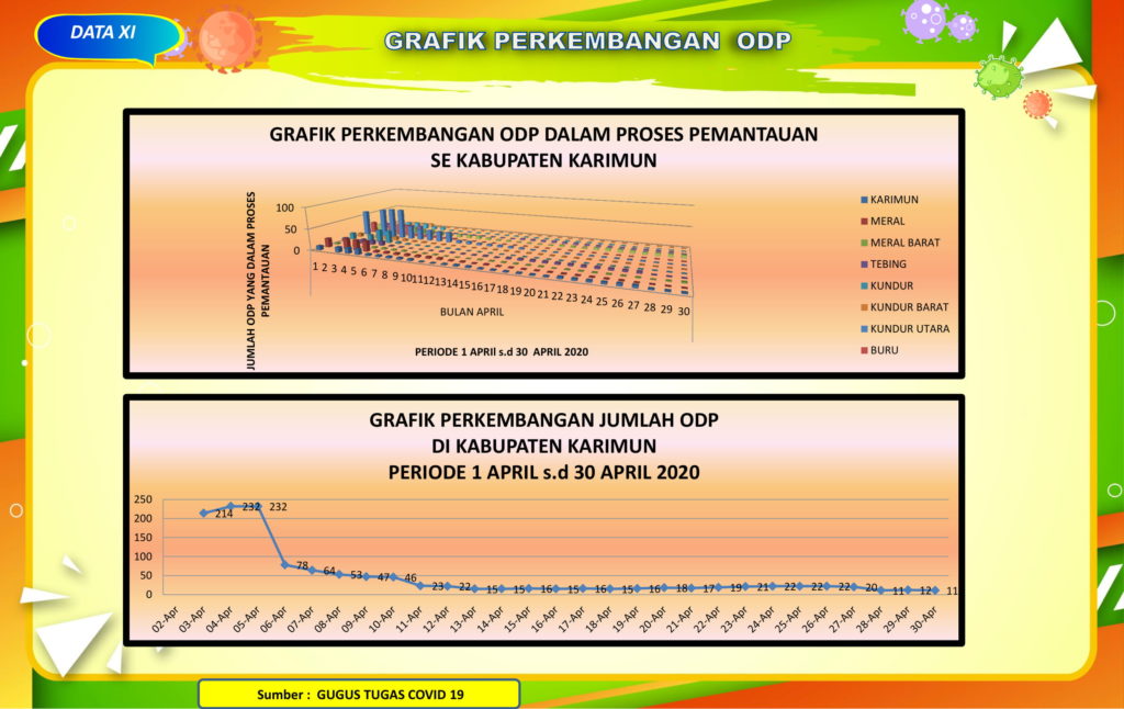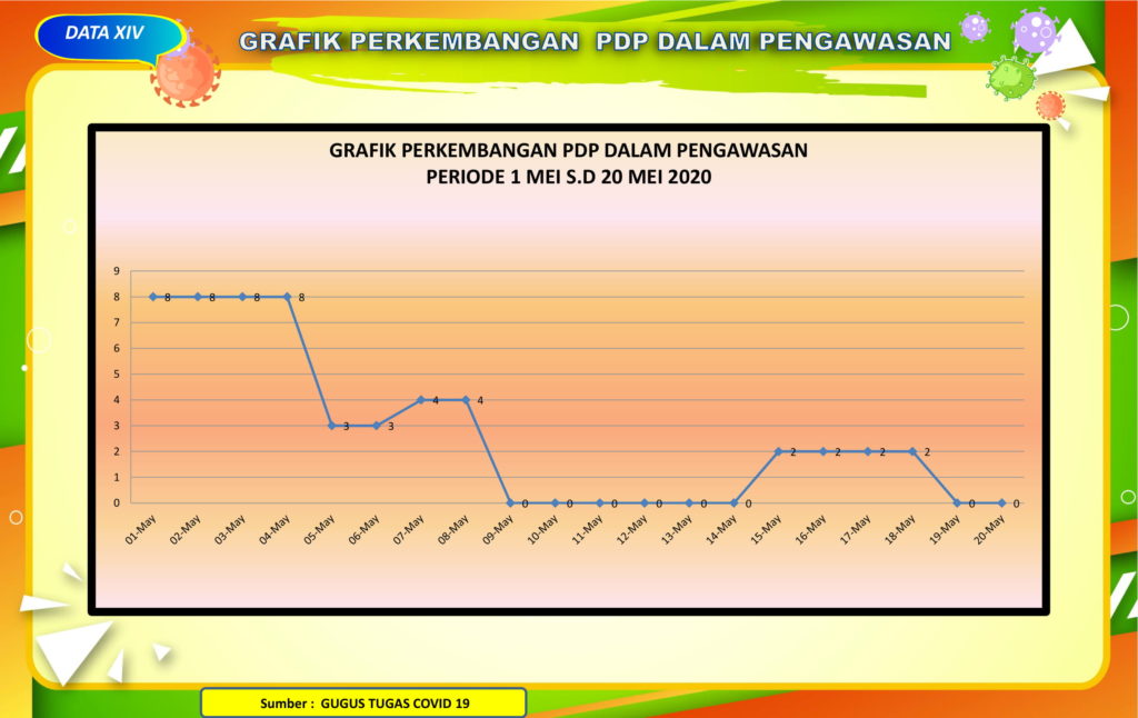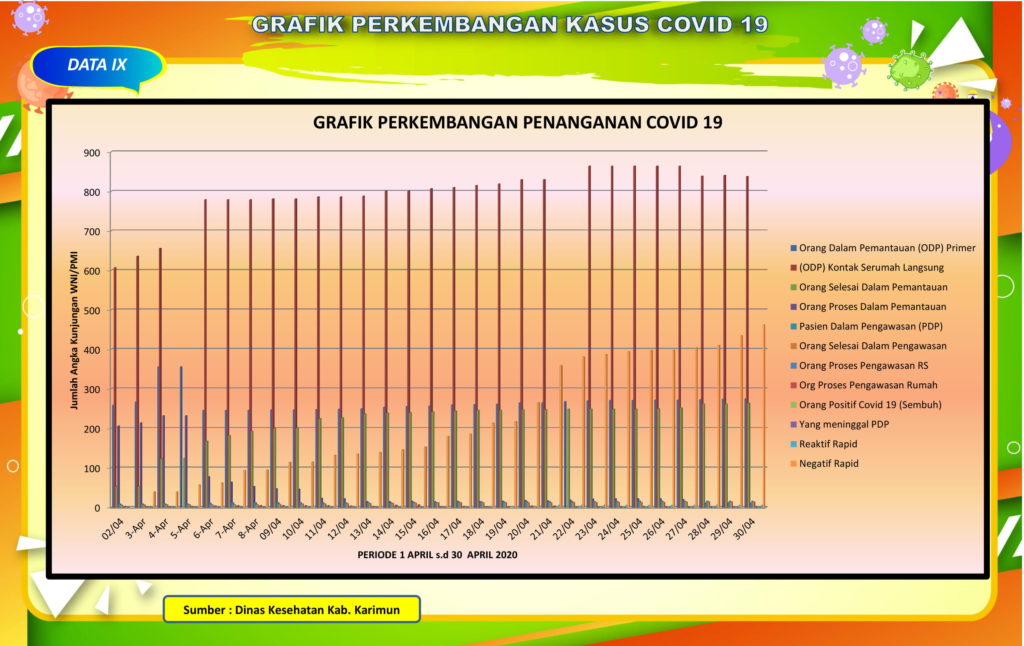 Dalam Matrik tersebut, terlihat bahwa saat ini ODP sebanyak 281 orang yang dalam proses pemantauan ada dua orang dan selesai pemantauan 279 orang. Kemudian PDP sebanyak 24 orang dimana proses pengawasan nihil dan selesai pengawasan 24 orang, selanjutnya OTG sebanyak 451 orang dimana hasil Rapid Tes Reaktif berjumlah 6 orang dan hasil Rapid Tes non Reaktif berjumlah 445 orang.