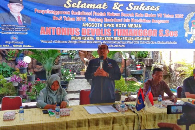 “PAD yang maksimal akan mendorong pembangunan yang berkesinambungan, adil dan makmur. PAD akan kembali kepada masyarakat juga, bertujuan untuk mensejahterakan, melalui pembangunan dan lainnya. Itulah tujuan sosialiasi hari ini, agar kita semua benar-benar memahami hak dan kewajiban kita,” ujar Antonius saat membuka kegiatan Sosialisasi Peraturan Daerah No 5 Tahun 2012 tentang Retribusi Izin Mendirikan Bangunan, di halaman Gereja Katolik St Paulus, Jl Kemuning Raya No 1 Kelurahan Helvetia Kecamatan Medan Helvetia, Minggu (3/7/2022).