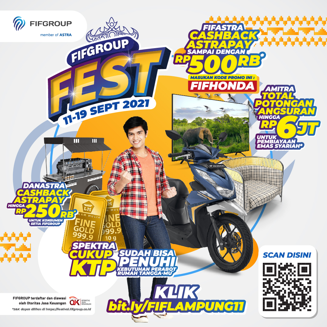 Kepala Wilayah FIFGROUP Lampung – Bangka Belitung, Danar Fitrahartoto, mengatakan : “Setelah berhasil mengadakan kegiatan FIFGROUP FEST di Bangka Belitung pada 4 September 2021, kini saatnya kami hadirkan khusus untuk warga Lampung, tentu jangan lewatkan kesempatan emas ini.” FIFGROUP Better Life, Better Future.