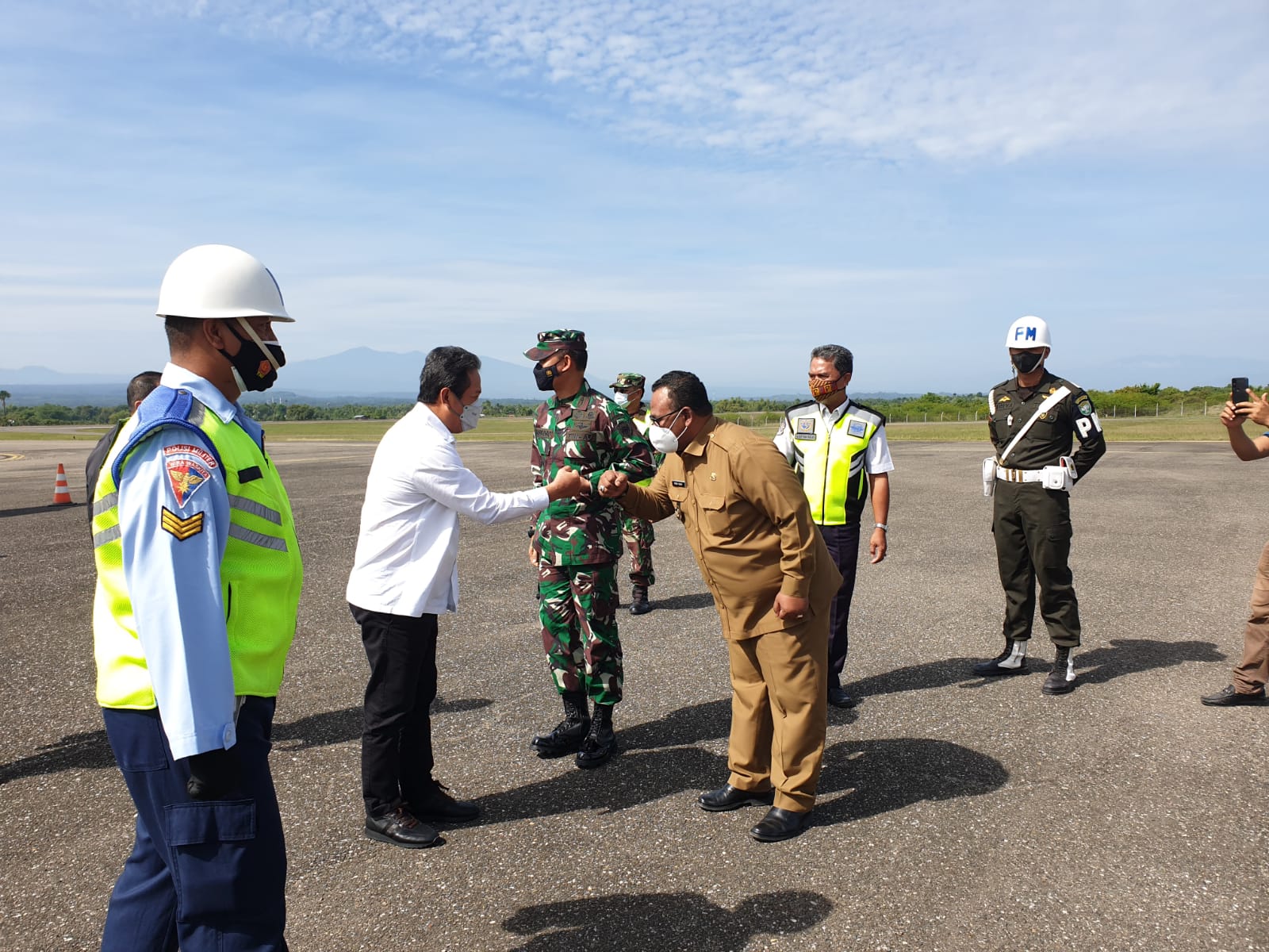 Wakil Bupati Aceh Utara Fauzi Yusuf menyambut kedatangan Menteri Kelautan dan Perikanan Sakti Wahyu Trenggono di Bandara Malikussaleh Kecamatan Muara Batu
