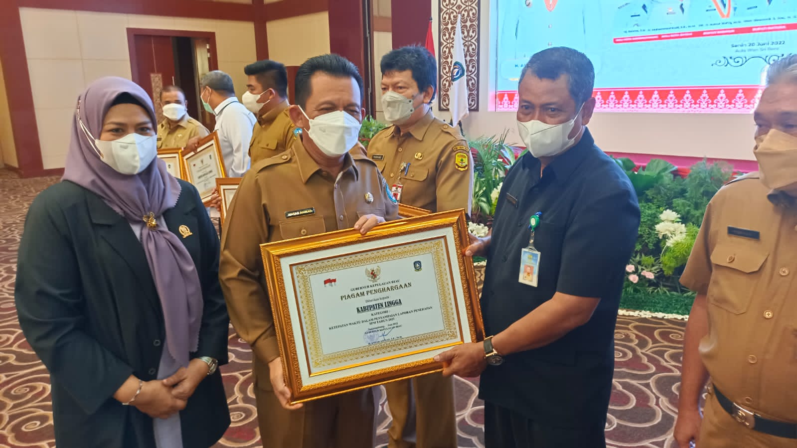 LINGGA, Potretnusantara.id -Pemerintah Kabupaten Lingga menerima penghargaan dari Gubernur Kepulauan Riau, kategori Ketepatan Waktu Dalam Penyampaian Laporan Penerapan Standar Pelayanan Minimal (SPM) Tahun 2021, di Aula Wan Seri Beni, Kantor Gubernur, Tanjungpinang, Senin (20/06/2022).