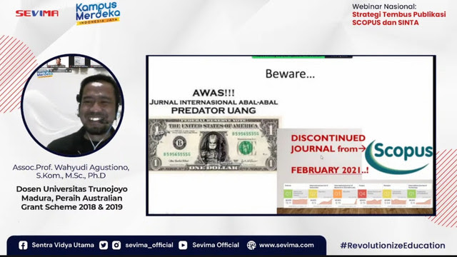 “Menulis sebuah jurnal memanglah bukan sebuah kegiatan yang mudah. Tapi sebenarnya ada banyak cara untuk membuat penulisan jurnal menjadi menyenangkan. Jangan sampai kita terjebak jurnal predator dan harus jual motor untuk meneliti!,” ungkap Arif didampingi Assoc.Prof. Wahyudi Agustiono, Dosen Universitas Trunojoyo Madura pada Webinar SEVIMA pada (28/12) sore.