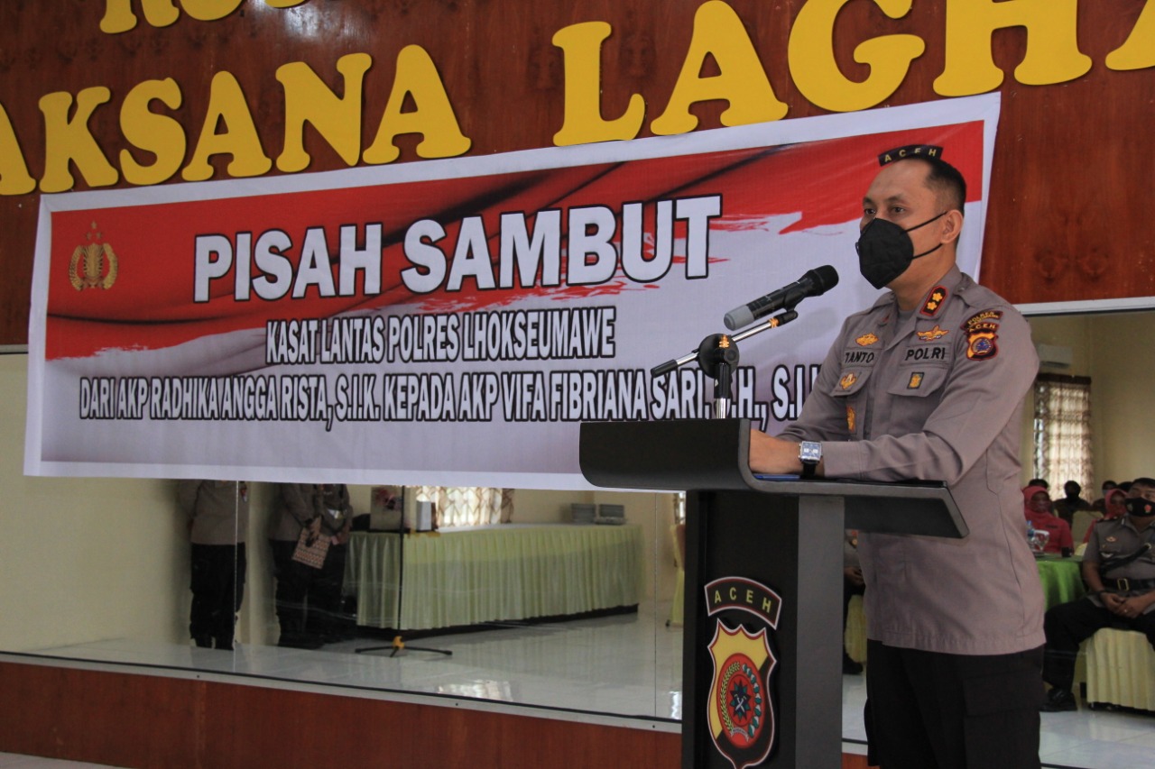 Hal tersebut di sampaikan Kapolres Lhokseumawe saat upacara sertijab Kasat Lantas dari AKP Radhika Angga Rista, S.I.K kepada AKP Vifa Febriana Sari, S.H, S.I.K, M.H yang dihadiri oleh Waka Polres Lhokseumawe, para kabag, Kasat, perwira staf serta Brigadir Polres Lhokseumawe dari masing-masing satuan yang berlansung yang di gedung Wirasatya Mapolres Lhokseumawe, senin pagi (14/06/2021).
