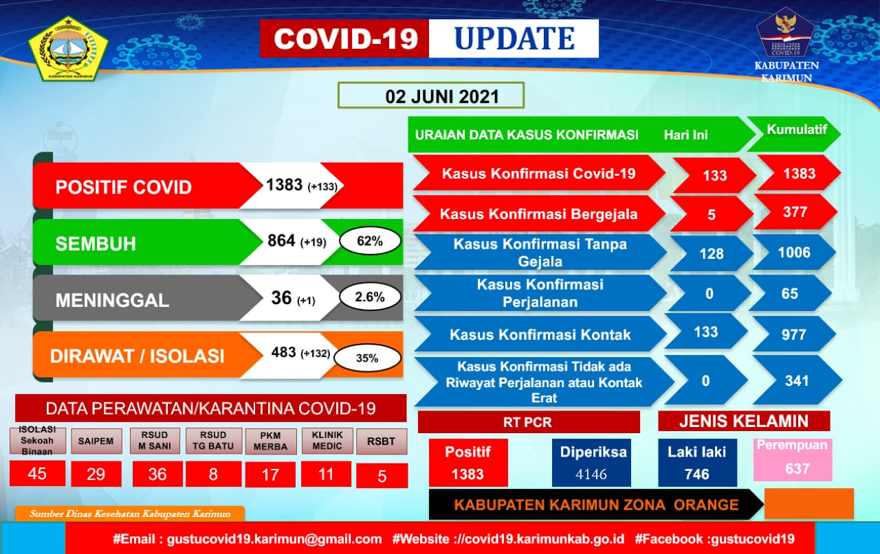 KARIMUN, Potretnusantara.id- Kabupaten Karimun, hari Rabu (02/06) sekira pukul 14.55 wib diumumkan dalam rilisnya oleh juru bicara tim gugus tugas Kabupaten Karimun menyampaikan bahwa pasien covid 19 di Kabupaten Karimun mengalami penambahan 133 orang.